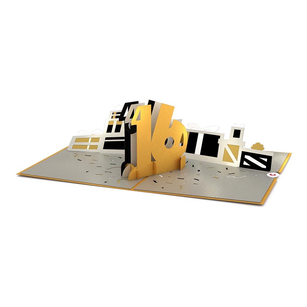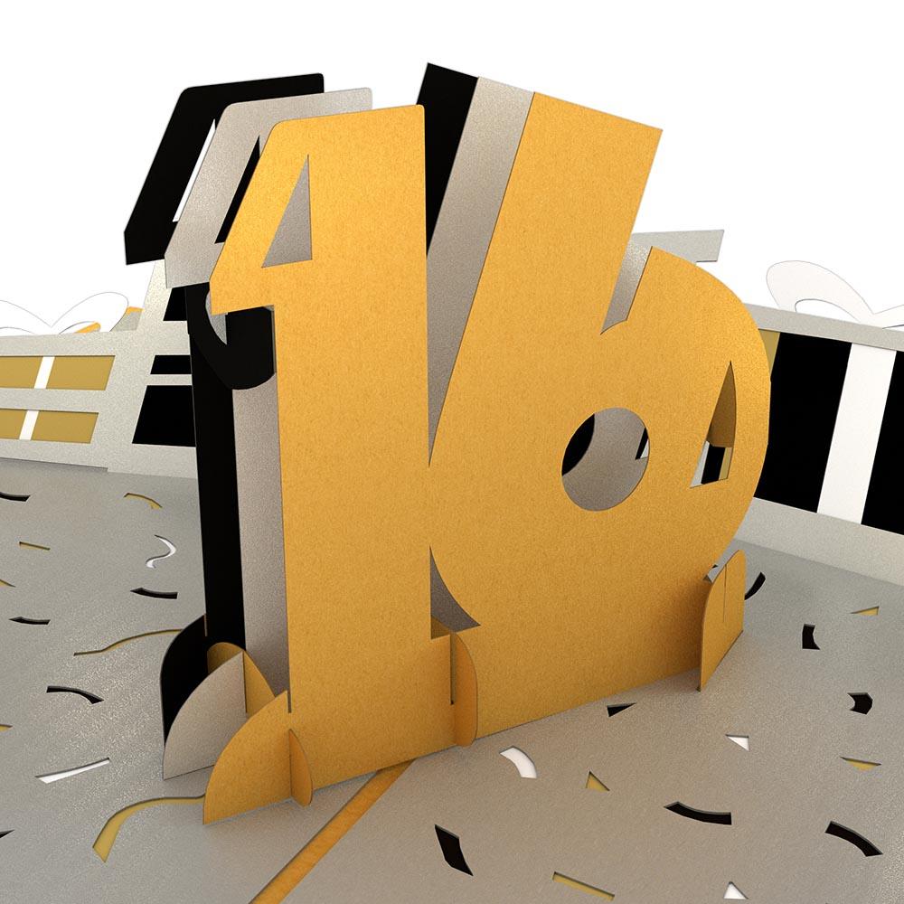 The golden yellow cover of the 16th Celebration pop-up card features a white, laser-cut number 16 contained within a gray-lined box.