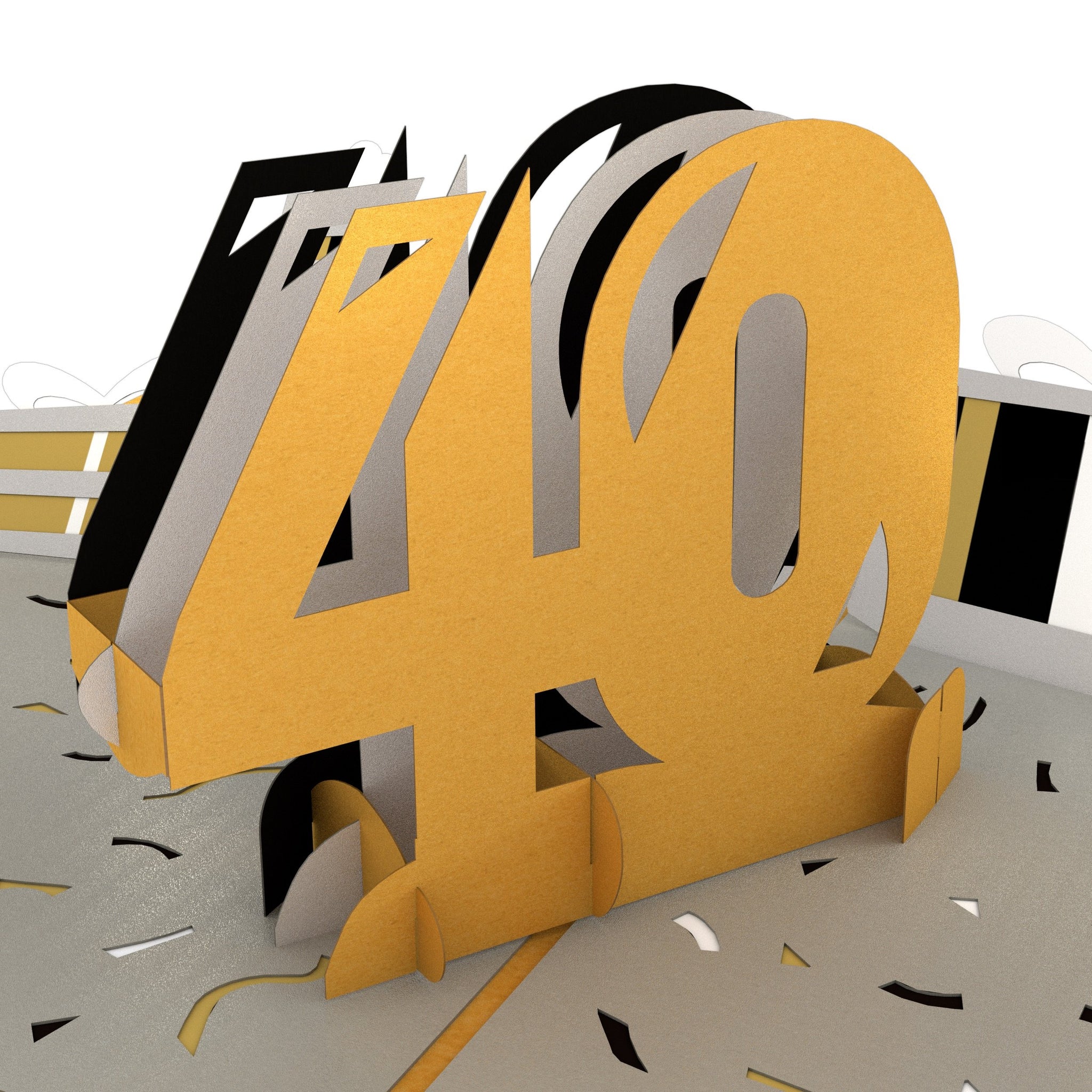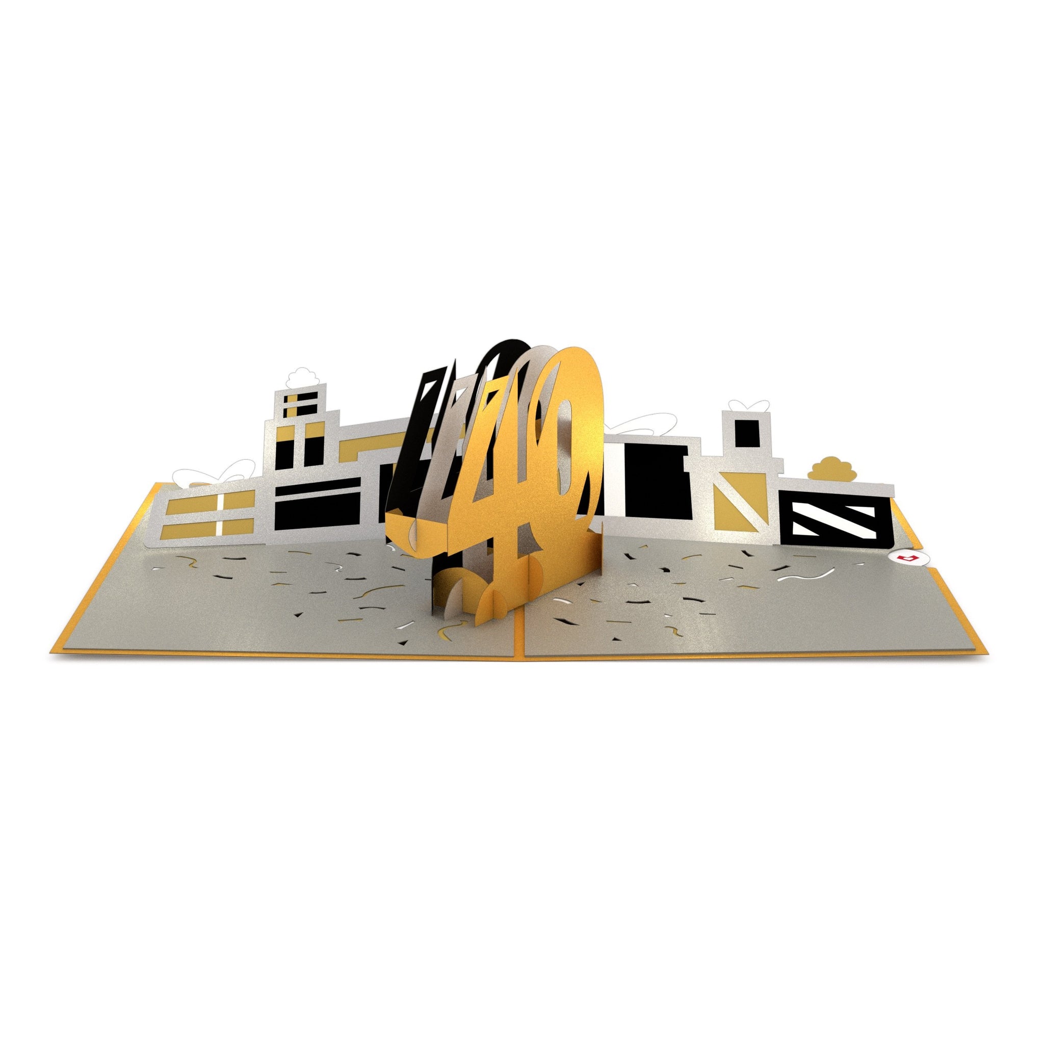 The front of this celebratory pop-up card features a laser-cut white number 40 surrounded by a silver boxed border design. The metallic golden yellow cover is the perfect way to celebrate the luxury of a 40th Celebration! As soon as your open this card, the party begins! Black, silver, and gold presents are stacked up in the background, surrounded by popped confetti. A metallic pop up number 40 serves as the highlight of this design.